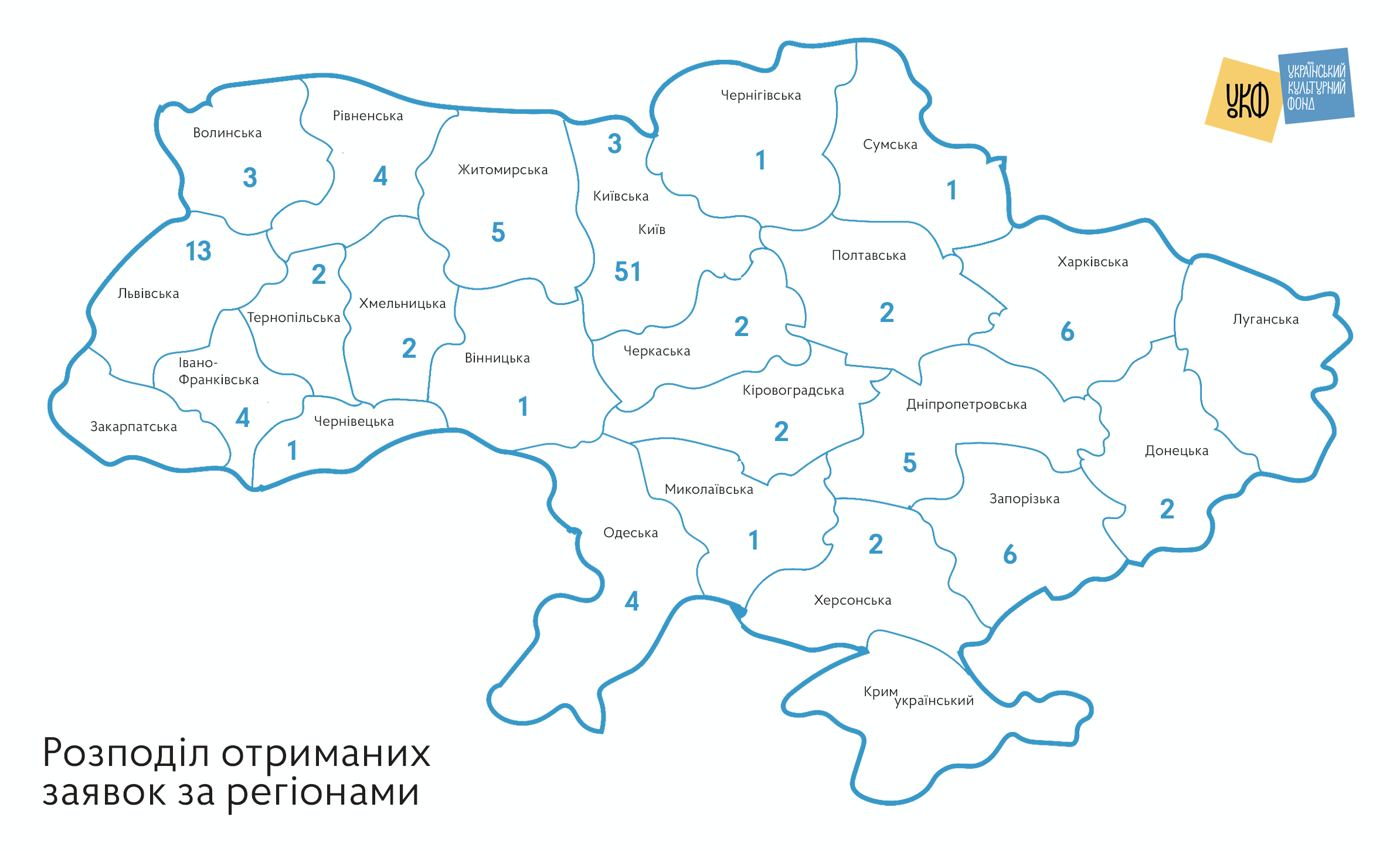 Перше місце за кількістю поданих заявок посів Київ – 51, друге місце у Львівщини – 13, третє у Харківщини та Запоріжжя – по 6 заявок.
