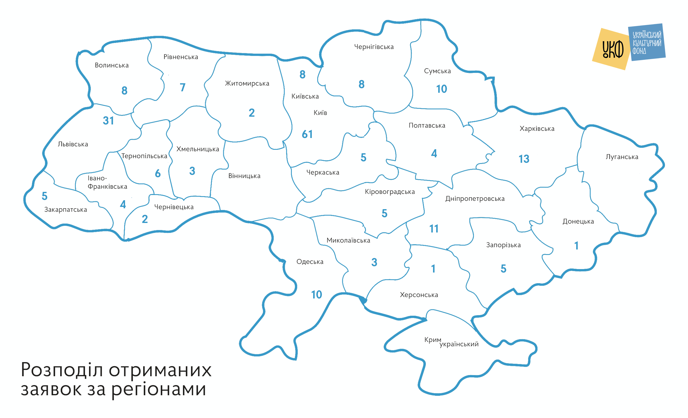 Перше місце за кількістю поданих заявок посів Київ – 61, друге місце у Львівщини – 31, третє місце у Харківщини – 13 заявок.