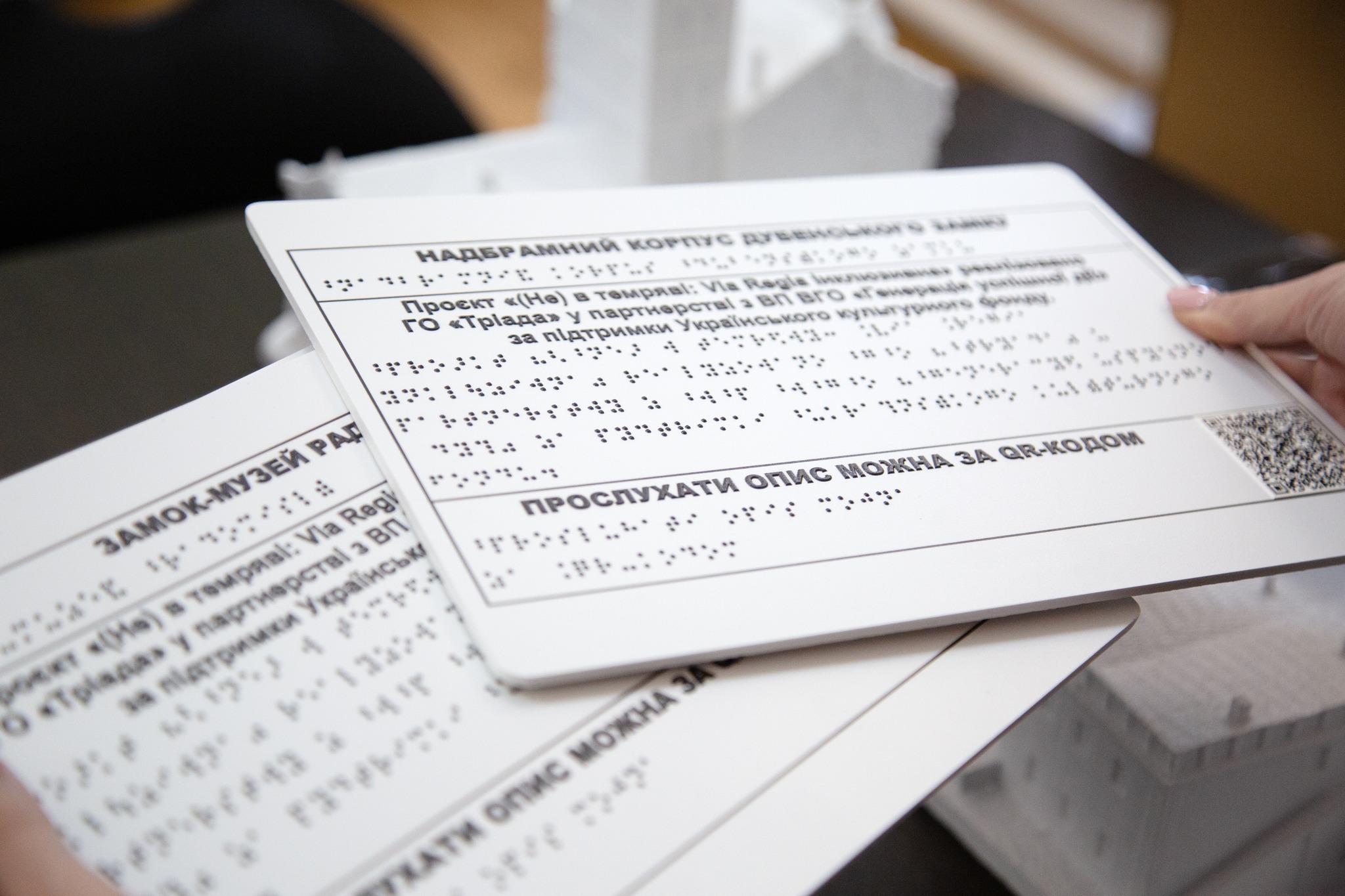 Кожен макет доповнено тифлокоментарем – детальним аудіоописом, який можна прослухати, відсканувавши QR-код на супровідній табличці, що дозволить незрячим та слабозорим відвідувачам почути історію культурної спадщини.
