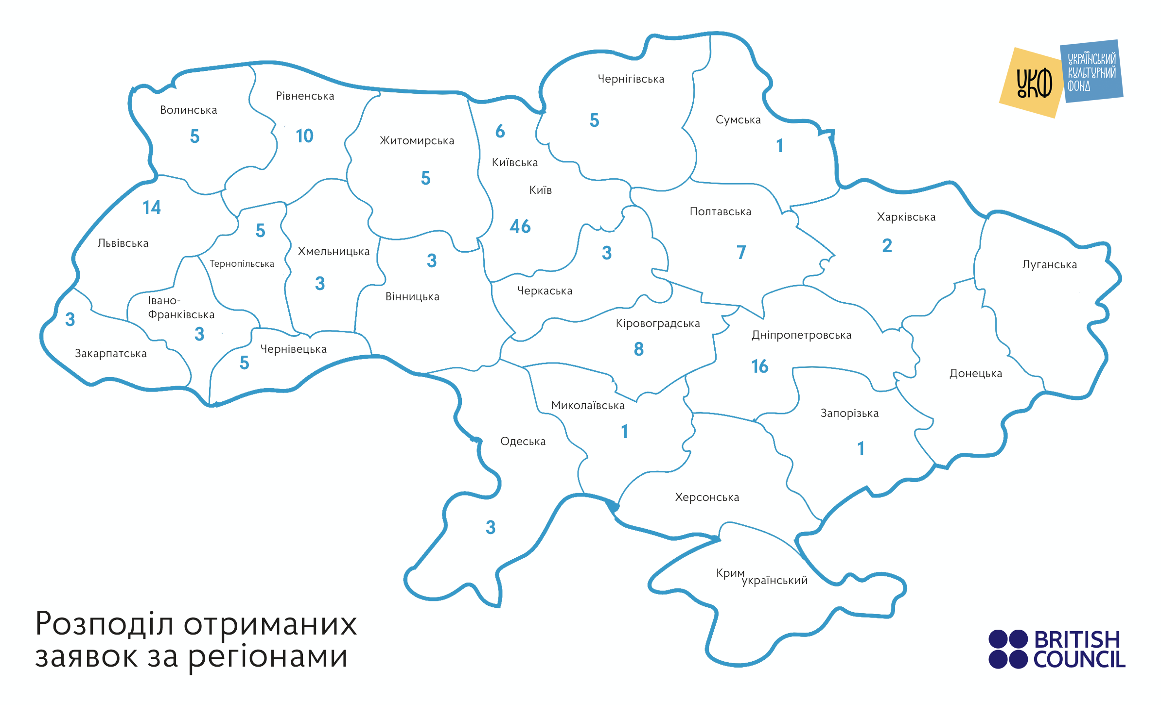 Перше місце за кількістю поданих заявок посів Київ – 46, друге місце у Дніпропетровщини – 16, третє місце у Львівщини – 14 заявок.